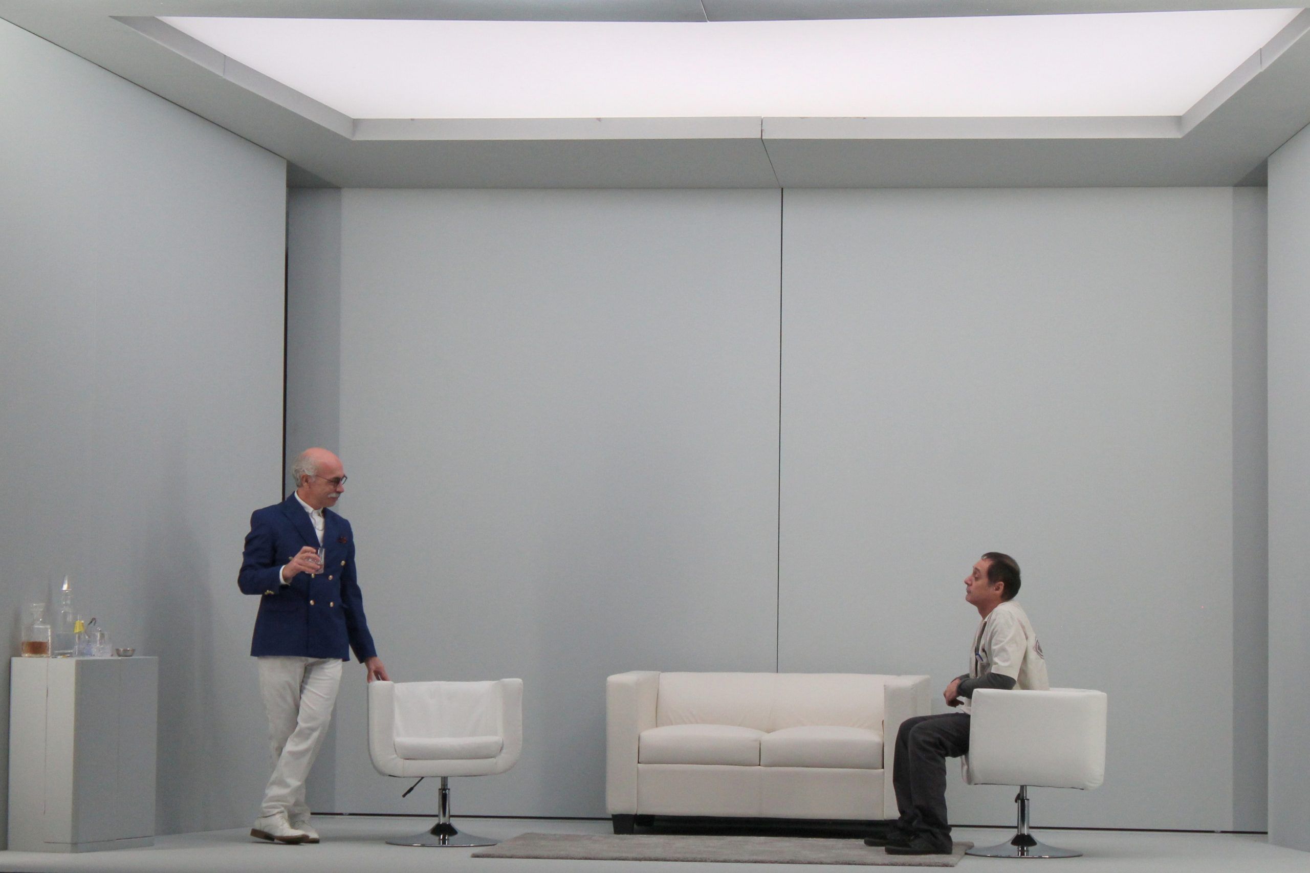 Un terzo amico, Yvan – che ha già abbastanza guai con i preparativi del suo matrimonio –, non prende posizione, venendo accusato dagli altri due di pusillanimità e doppiezza. Così, la serata che i tre decidono di trascorrere insieme si trasforma in un regolamento di conti, in un gioco al massacro. Il quadro bianco a righe bianche diventa il rivelatore da cui affiorano a poco a poco nevrosi, risentimenti e rivalità, mentre le parole si fanno sempre più velenose, sempre più acuminate, fino a ridurre in macerie la fragile impalcatura di un rapporto fondato sull’egoismo, la vanità e l’ipocrisia. Yasmina Reza, di cui conosciamo la penna affilata e lo sguardo chirurgico, tocca in questa commedia nera vette di comica crudeltà, si diverte e ci fa divertire – perché ridiamo molto, anche se sempre più a denti stretti, a mano a mano che da sotto la maschera buffa del théâtre de boulevard vediamo spuntare la malinconia.